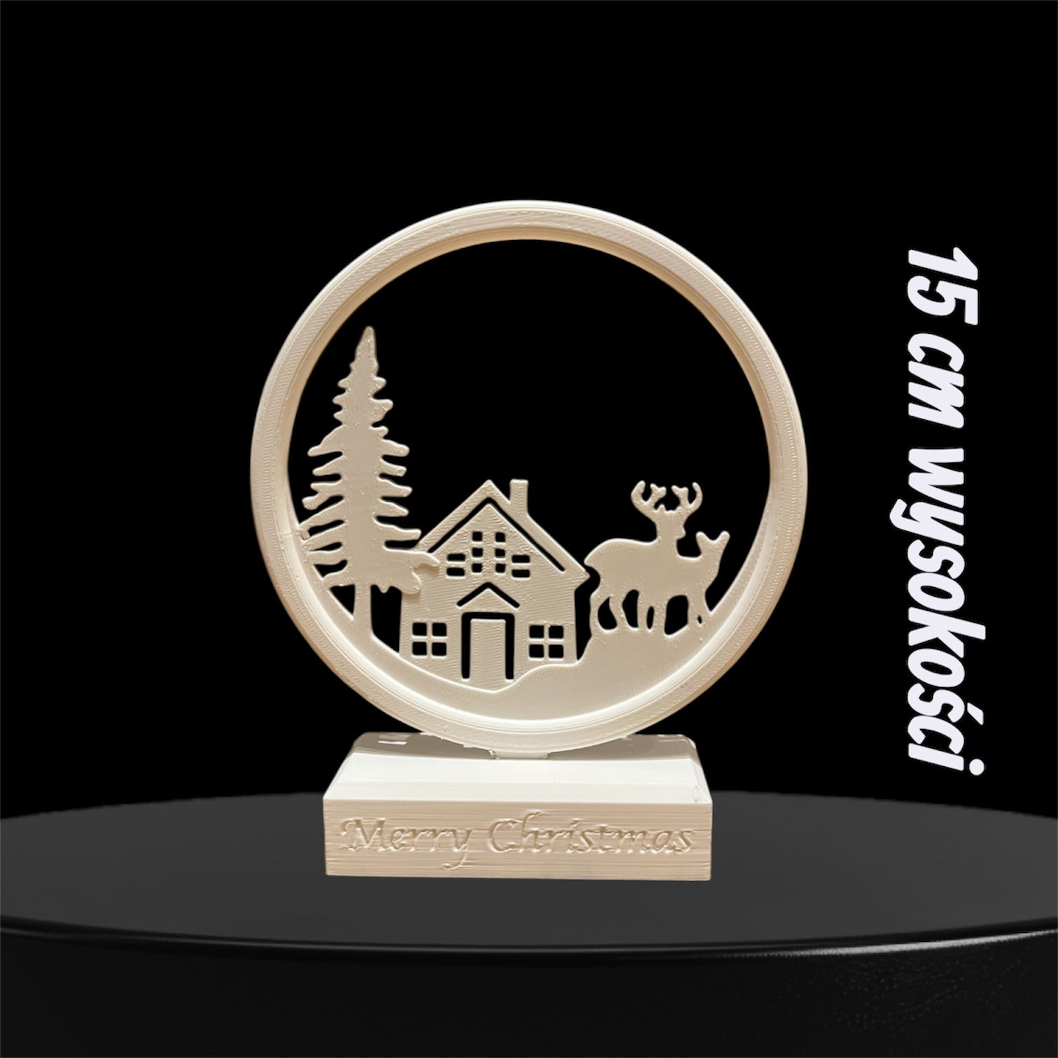 Delikatny, śnieżnobiały projekt przedstawia uroczy domek, choinkę i renifera zamknięte w okrągłej ramie z napisem „Merry Christmas”. Idealna ozdoba na biurko, półkę lub parapet – szczególnie w okresie zimowym.
